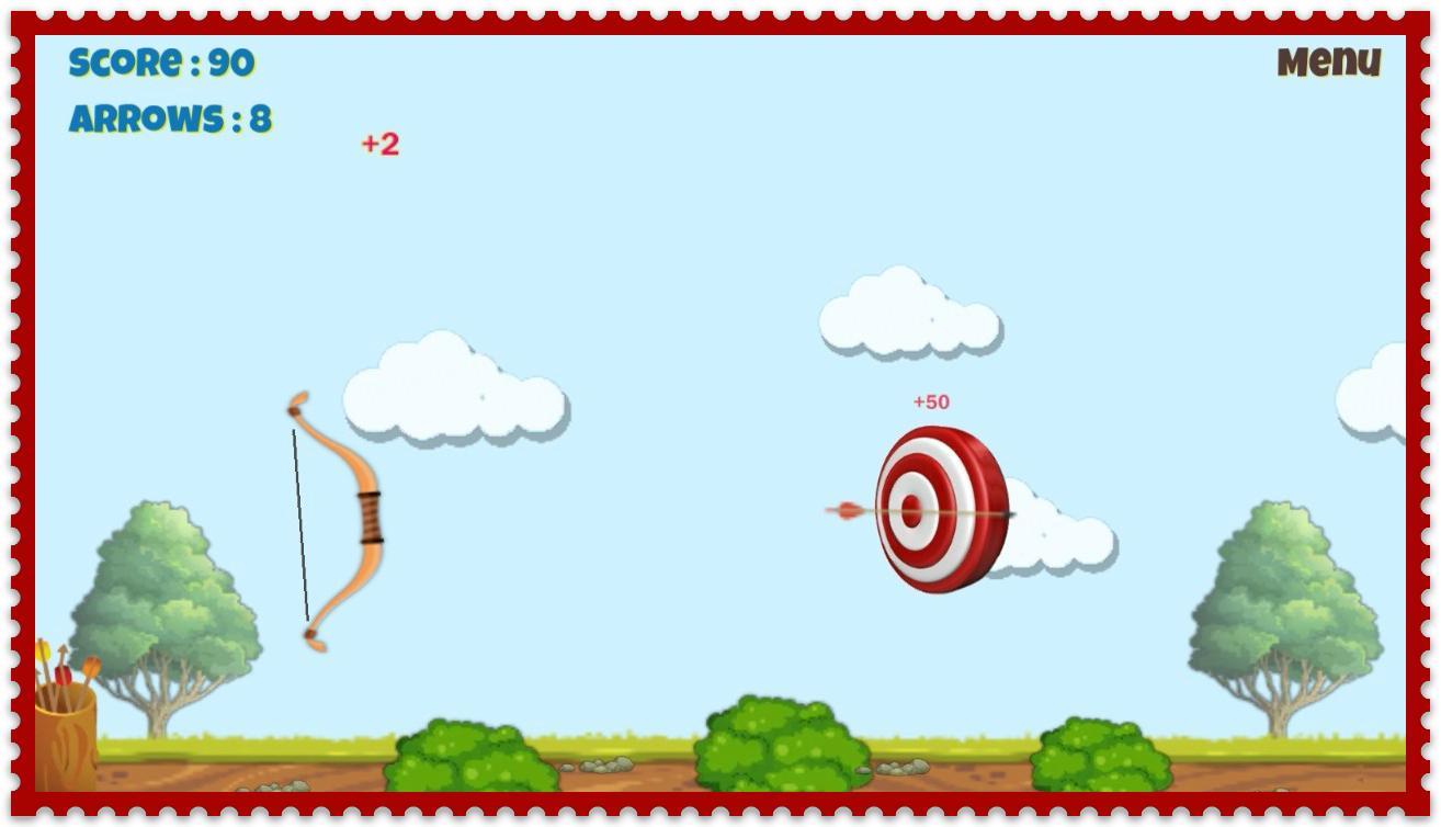 ゲームの意味は非常に単純です。弓と矢印(限られた数)が与えられ、ターゲットとターゲットを正しくヒットする必要があります。理想的なヒットターゲットでは、2つの矢印が得られますが、見逃した場合は何もありません。すべての矢を使うとゲームは終わりました。アーチェリーの特定のスキルと経験では、ゲームをほぼ無限に拡張できます。当然、ゲームごとにポイントを獲得すると、最高の結果がハイスコアテーブルに分類されます。得られたポイントで、弓をより詳細にアップグレードできます。新しい矢印を購入してターゲットを変更します。