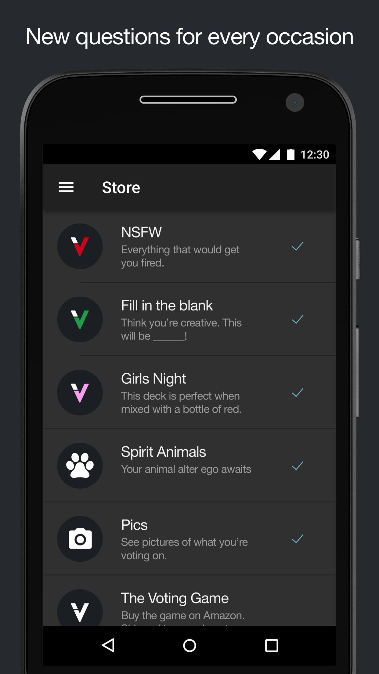 The Voting Gameは、私たちの友人に関する大人のパーティーゲームです。このアプリには、すぐに再生を開始できるすべての新しい拡張パックがあります。