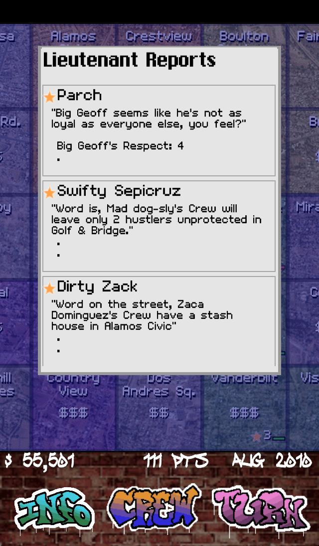 그러나 자신의 남자를 주시하는 것을 잊지 마십시오. 거리에서 존경은 모든 것입니다. 쿠키 스카우트가 줄을 벗지 않으면 응답해야합니다. 분쟁을 해결하고, 중위를 홍보하고, 호화로운 파티를 던지고, 으르렁 거리며, 귀중한 소문을 추적하며, 비뚤어진 변호사와 함께 열을 막아 승무원을 보호하십시오.