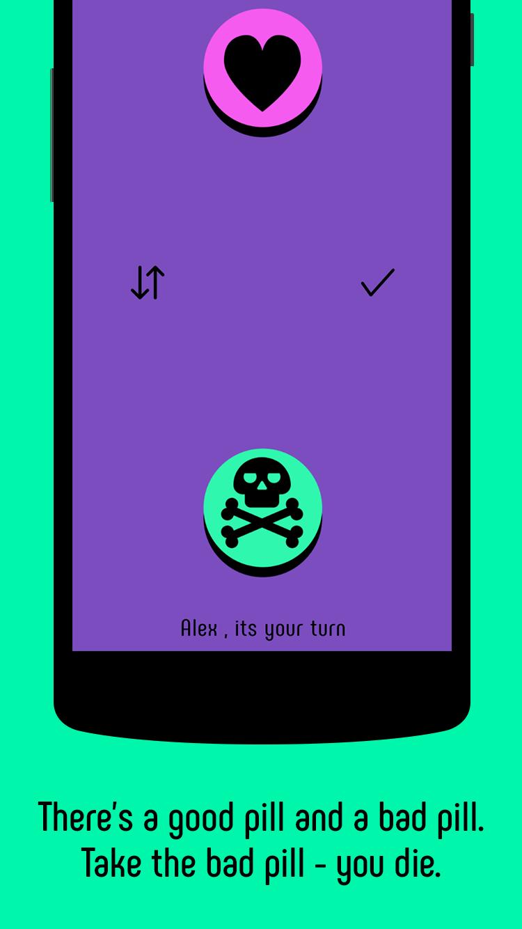 당신의 라이벌은 당신에게 좋은 약이나 나쁜 알약을 주었습니까? 허세인가요? 아니면 더블 블러 프? 아니면 트리플 블러 프? 1 게임, 1 개의 움직임, 생존자 1 개.
