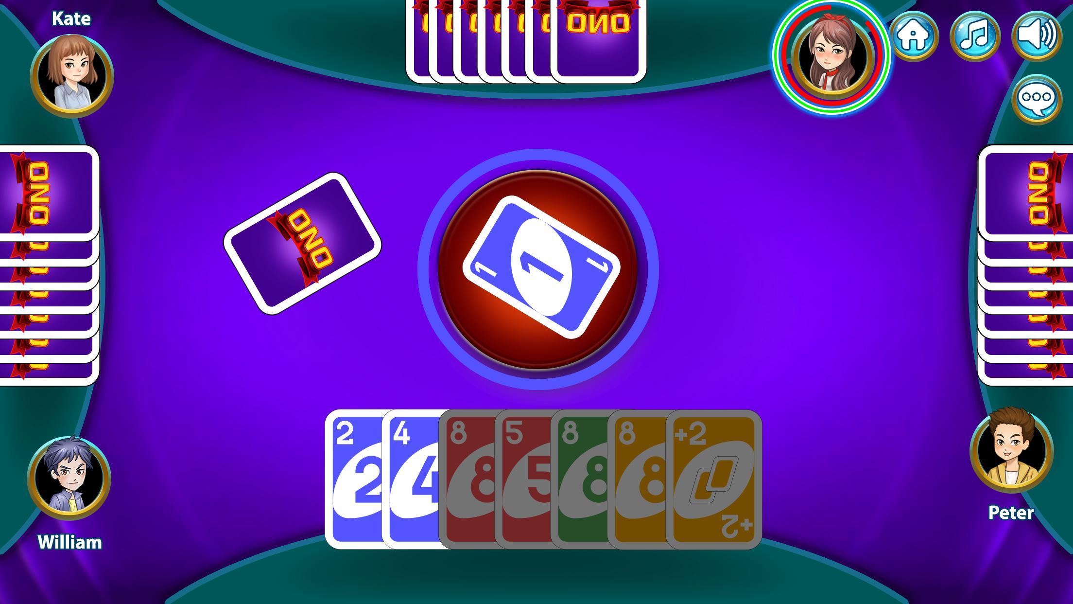 이 멋진 4 명의 선수 Ono 게임에서 모든 카드를 모두 제거한 최초의 플레이어가 되십시오! 오노 네 가지 색상의 색상과 이름으로 카드를 매치! 데크에 카드가 1 개 밖에 남지 않으면 1 버튼을 누르지 않으면 페널티 카드 2 개를 선택합니다.
