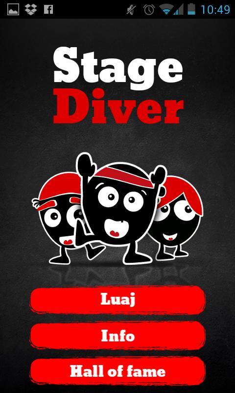 Mobile App hej!StageDiver é para a estrela do rock em você. A estrela do rock que se esforça para ser ousada! O Stagediver é um jogo para hábil e ousado. O objetivo é manter seu mergulhador nas mãos da multidão o maior tempo possível. Quanto mais você mantém seu mergulhador nas mãos da multidão, mais pontos você recebe! Quanto melhor o salto na luz, maior os pontos que você receberá. Rock on!