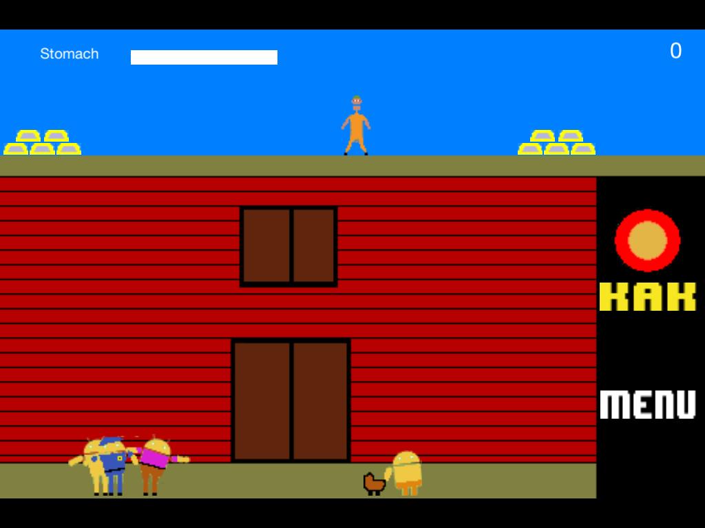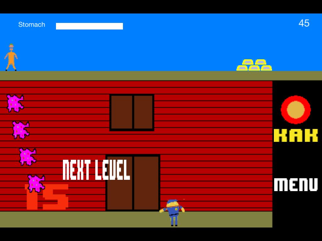 Você controla o mestre de kak ou o garoto de arremesso. Você move seu personagem girando o dispositivo para a esquerda ou para a direita. Pressione o botão "Kak" quando quiser vomitar, mas tenha cuidado para não acertar um policial!