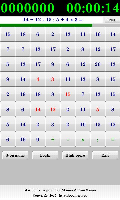- Depois que cada expressão correta for feita, os números selecionados serão excluídos. A máquina gerará aleatoriamente n novos números. No começo, o valor de n é 3. A pontuação mais alta é: o N maior é.