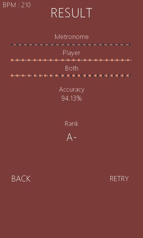 И тогда вы можете тренировать себя! Вы можете изменить BPM (Beats Per Minuite), CPB (клики за удар) и BPB (удары за бар), как вы хотите. И вы можете слышать звуки метроном на некоторое время. Услышав звук, вы должны нажать на экран так же, как метроном, который вы слышали некоторое время назад.