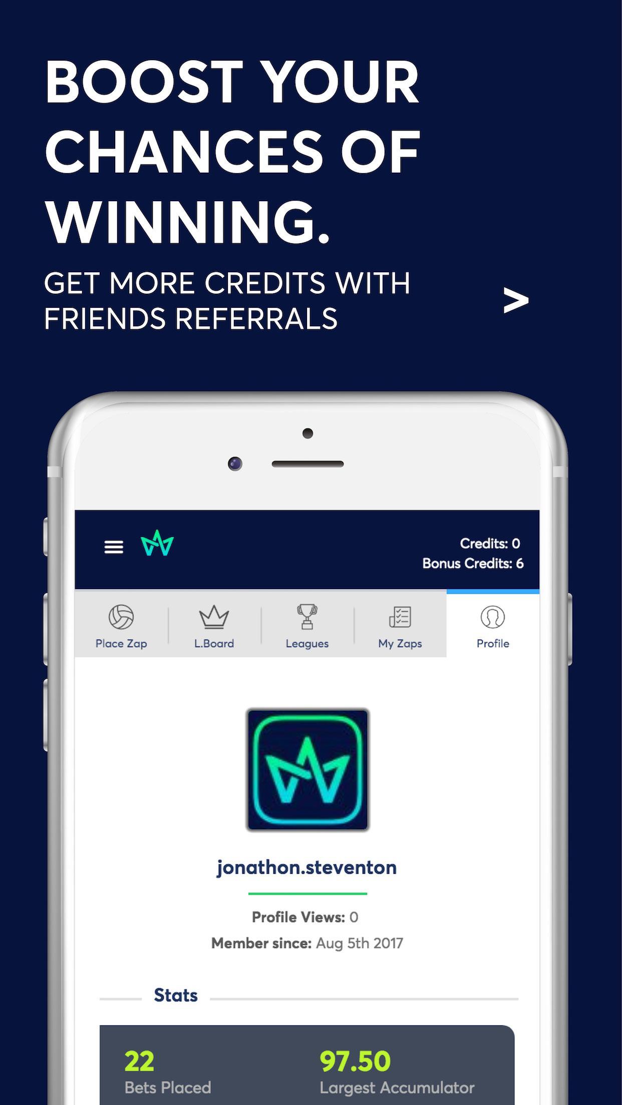 Увеличьте свои шансы - увеличивайте свои шансы на победу, заставив своих друзей присоединиться к Winzap . Мы дадим вам дополнительные 10 кредитов для каждого друга, которого вы ссылаетесь! Чем больше кредитов у вас больше шансов на победу.