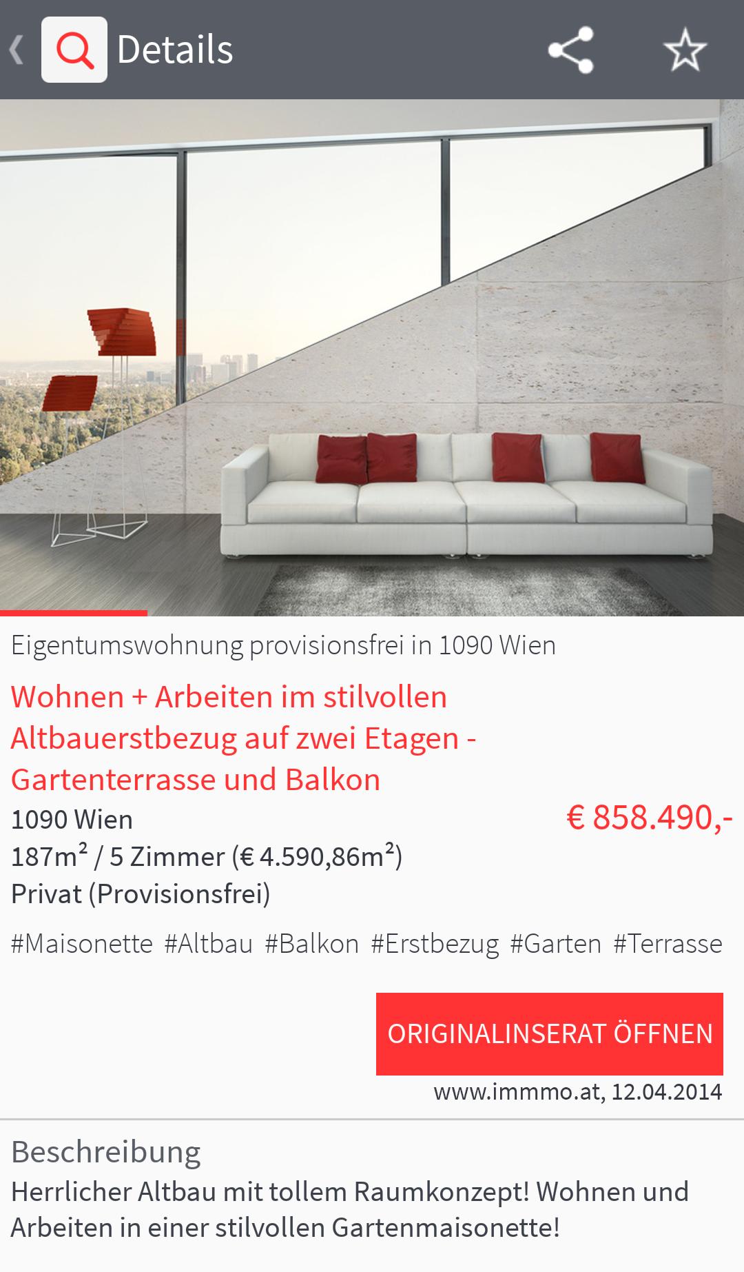 IMMMO ค้นหาผ่านเว็บไซต์อสังหาริมทรัพย์ที่เกี่ยวข้องทั้งหมดในออสเตรียและสร้างรายชื่อมากกว่า 150,000 รายการผ่านทางพอร์ทัลที่สามารถเข้าถึงได้ IMMMO .at ไม่เพียง แต่เร็วที่สุด แต่ยังเป็นพอร์ทัลส่วนตัวที่ใหญ่ที่สุดในออสเตรีย ข้อได้เปรียบที่ใหญ่ที่สุดของวิธีการนี้: การนำเสนอผลการค้นหาอย่างสม่ำเสมอภาพรวมข้อเสนอที่สมบูรณ์โดยไม่มีคำตอบหลายคำ