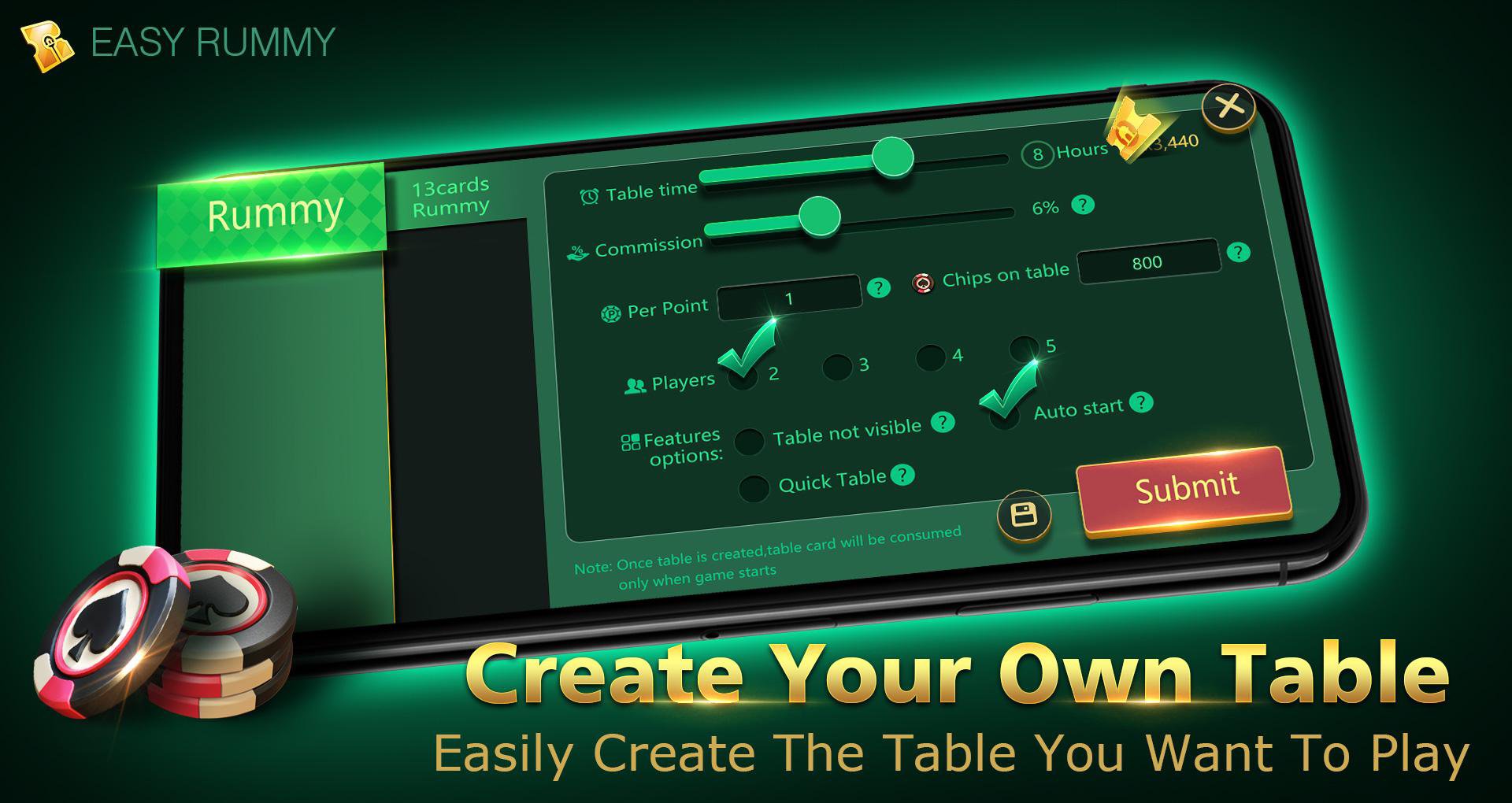 ฝันถึงสโมสรรัมมี่? การรอคอยไม่มีอีกต่อไป! สร้างคลับของคุณใน Easy Rummy โฮสต์เกมและเล่นกับเพื่อน ๆ ปรับแต่งตารางของคุณหรือจัดทัวร์นาเมนต์ 24*7 เชิญเพื่อนของคุณมาที่คลับของคุณและเริ่มเล่นด้วยกัน