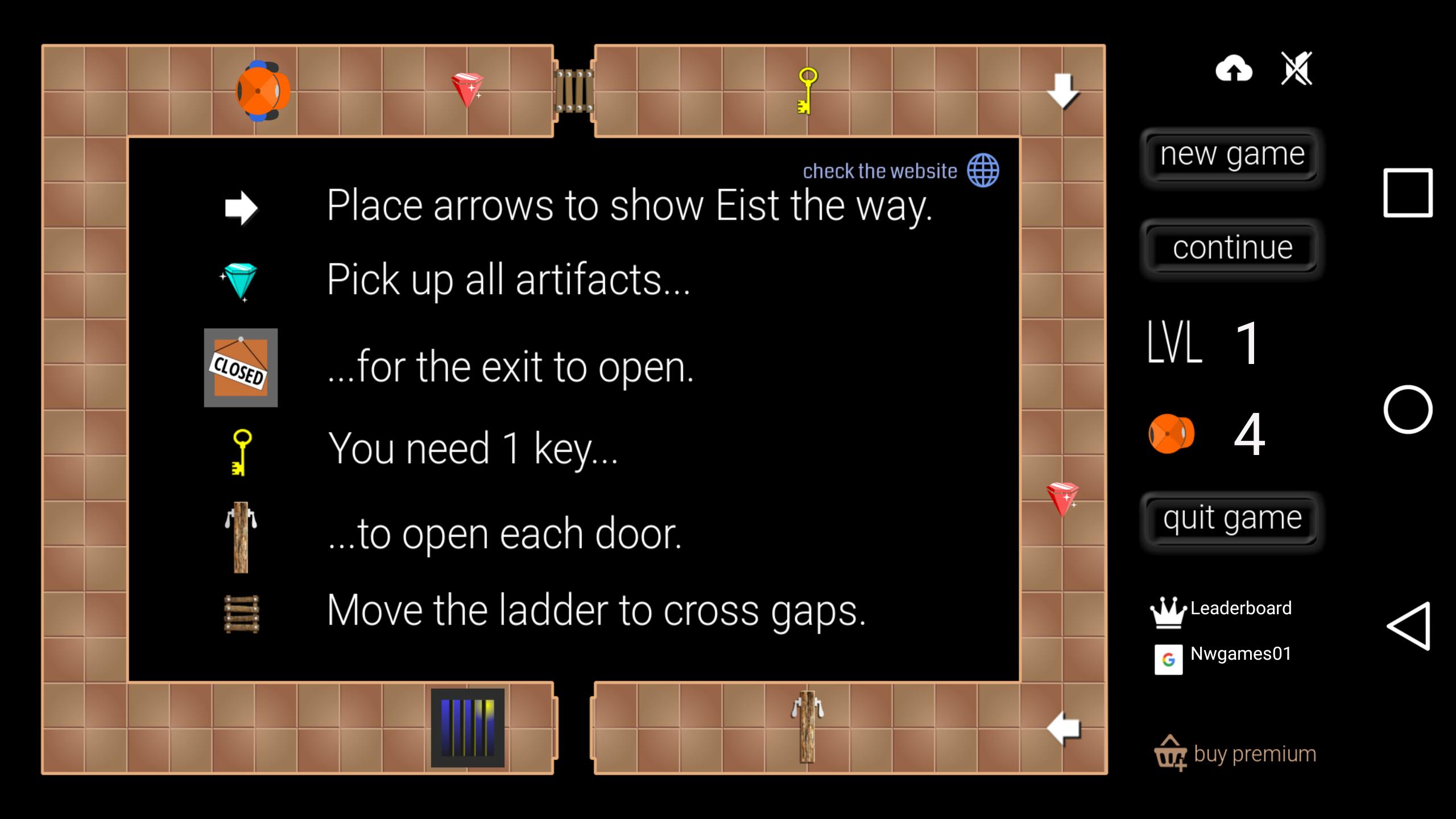 พกพา Eist ผ่านบอร์ดวางลูกศรระหว่างทางเพื่อระบุทิศทาง การสืบเชื้อสายจากเส้นทางจะทำให้เขาล้มลง คุณต้องรับสิ่งประดิษฐ์ทั้งหมดเพื่อออกเพื่อเปิด ระหว่างทางที่คุณจะได้พบกับประตู: คุณต้องมีกุญแจในการเปิดแต่ละอัน ใช้บันไดเพื่อข้ามช่องว่างในเส้นทาง มันสามารถตั้งค่าในสถานที่ที่กำหนดเท่านั้น แตะบันไดเพื่อหยิบมันขึ้นมาและตั้งค่าที่คุณต้องการ ในบางบอร์ดคุณจะได้พบกับเทเลพอร์ตด้วยเช่นกันพวกเขาย้าย Eist ไปด้วยกัน ข้อควรจำ: ทิศทางการเคลื่อนไหวยังคงเหมือนเดิม
