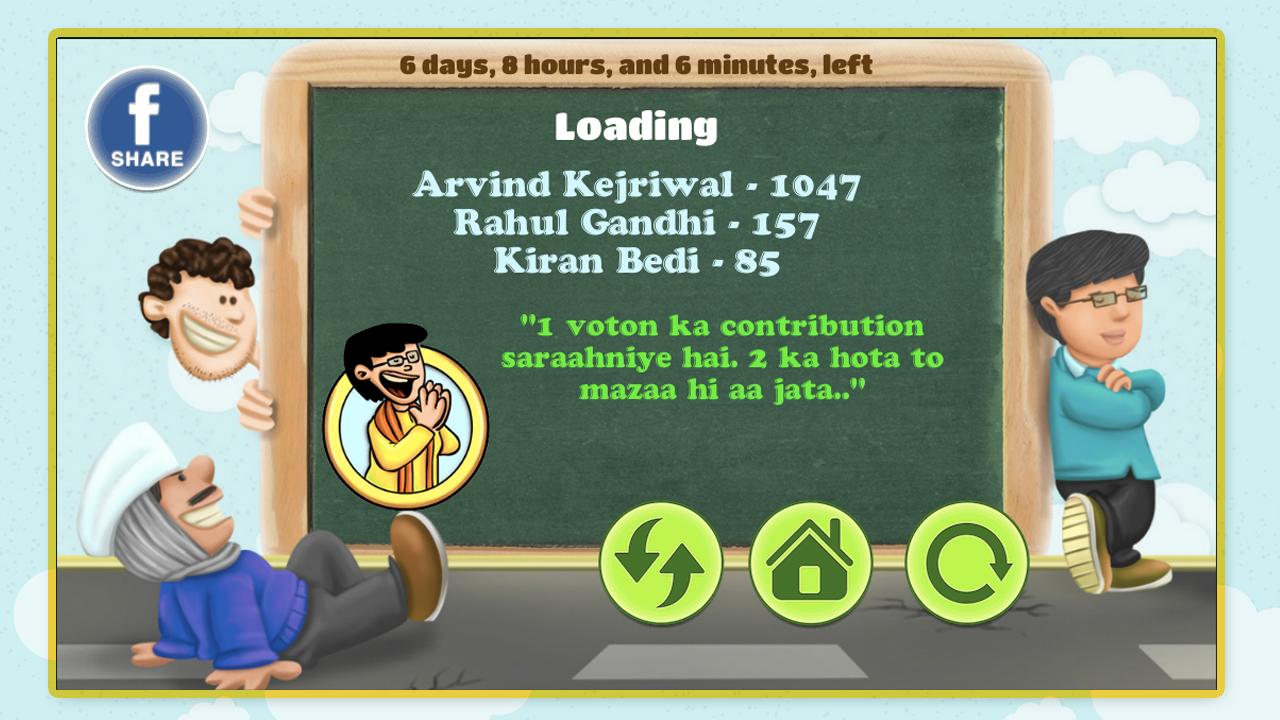 Disclaimer: The intent of this game is not to make fun of anyone or to hurt political feelings of anyone. It's just a fun-filled and light way of spreading awareness about the upcoming elections. Play this game and do vote on 7th Feb, 2015.