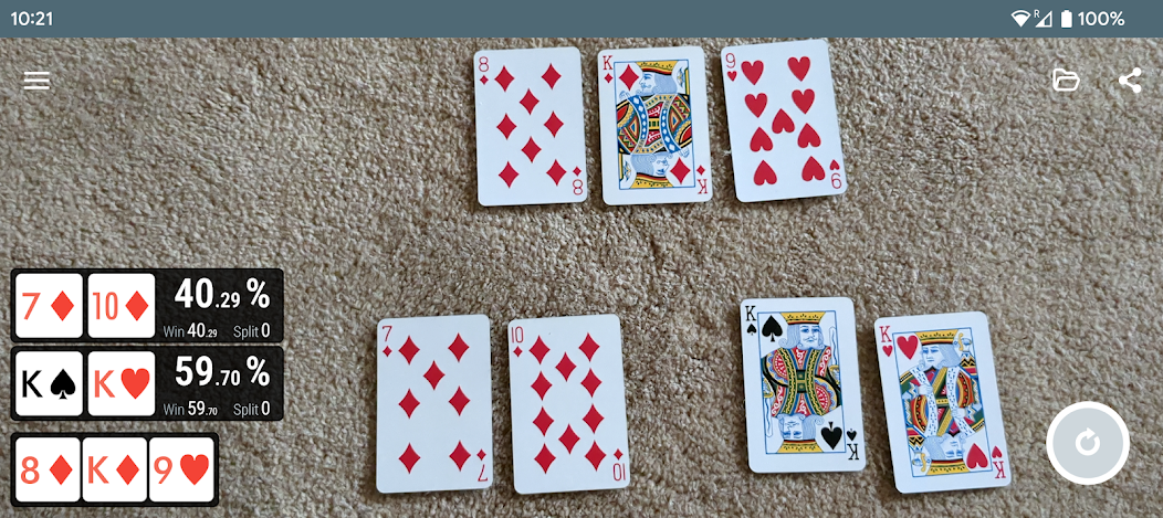 Poker Odds Camera เป็นแอปพลิเคชั่นที่จดจำเกมโป๊กเกอร์ผ่านกล้องและแสดงข้อมูลเกี่ยวกับเกมเช่นอัตราต่อรองและ/หรือค่าของแต่ละมือ