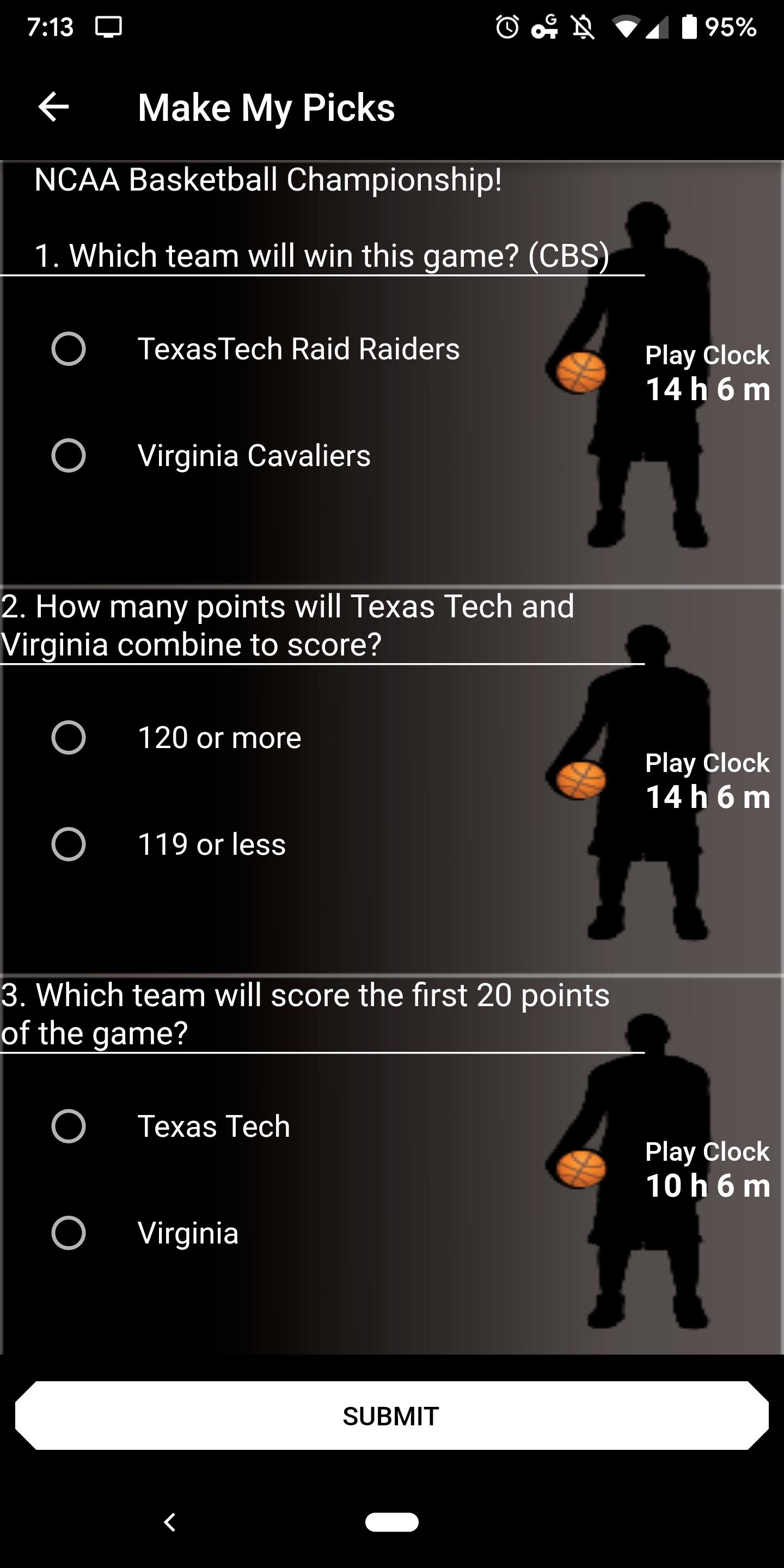 ·จะมี 12 คำถามต่อวันที่เกี่ยวข้องกับการแข่งขันกีฬาในวันนั้นและพวกเขาจะมีช่วงตั้งแต่ที่ทีมจะชนะจำนวนคะแนน/การวิ่งจะได้คะแนนและข้อเสนอที่หลากหลาย คำถามตัวอย่างอาจเป็น: