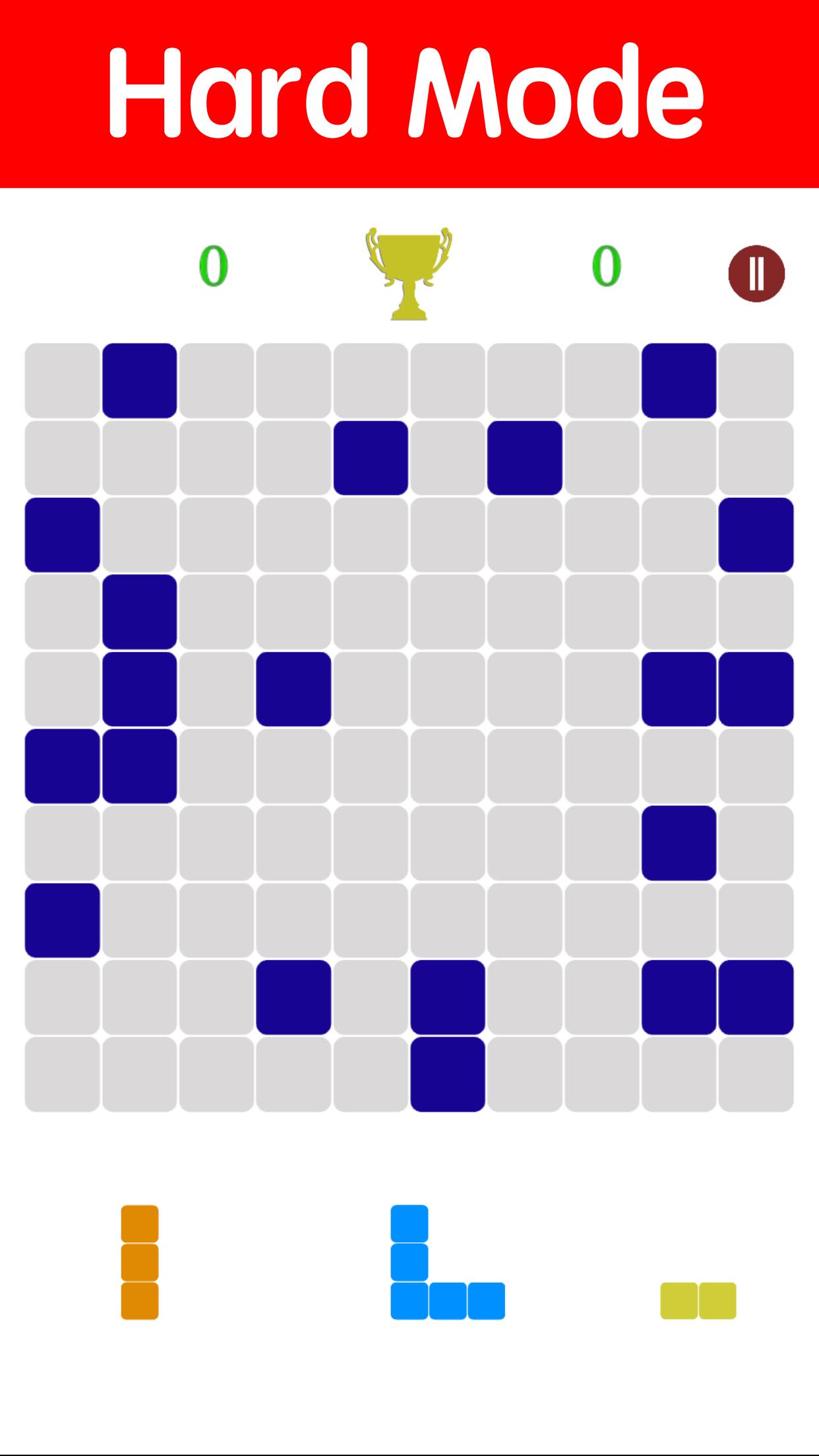 - 在硬模式下,最初随机放置20个块。如果块小于或等于10个块,则随机放置10个块,并获得额外的100分。