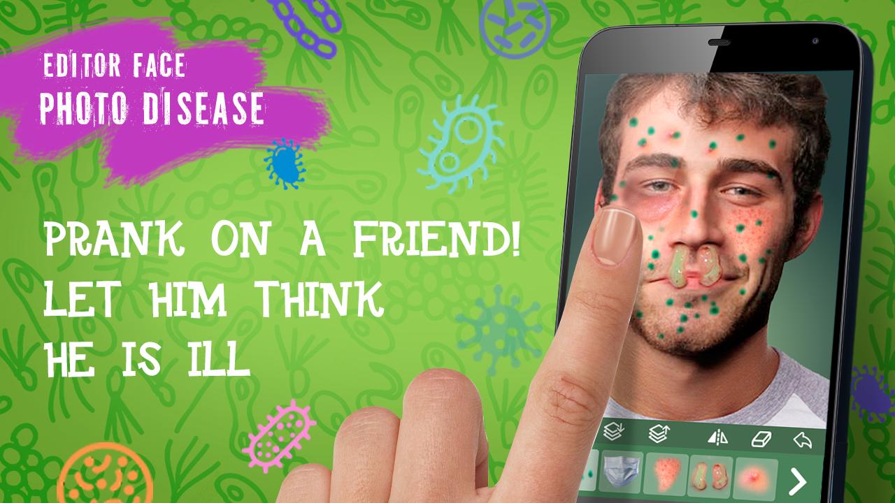 该人的编辑。疾病的照片。效果,过滤器以处理相机的照片。用手机拍照,打开该人的编辑。疾病和拼贴的照片,并在一个人的脸上增加疾病的凉爽层!做不同类型的感染以对朋友恶作剧!在没有闪光灯的情况下,在手机相机上拍摄朋友的照片,添加感染,过滤器,拼贴画和疾病层的效果,并获得非常有趣的照片!使用应用程序编辑者。照片疾病方便的编辑和处理照片!利用创建有趣的照片拼贴工具的所有机会!发送给朋友,告诉他他病了!编辑器允许您完全改变外观,并为病人拍照!该人的编辑。为照片笑话,照片娱乐和娱乐创建的照片疾病!
