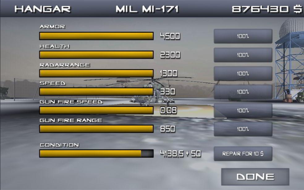 •直升机的升级:每次战斗直升机,盔甲,健康,雷达范围,速度和大炮都可以通过玩耍来升级。