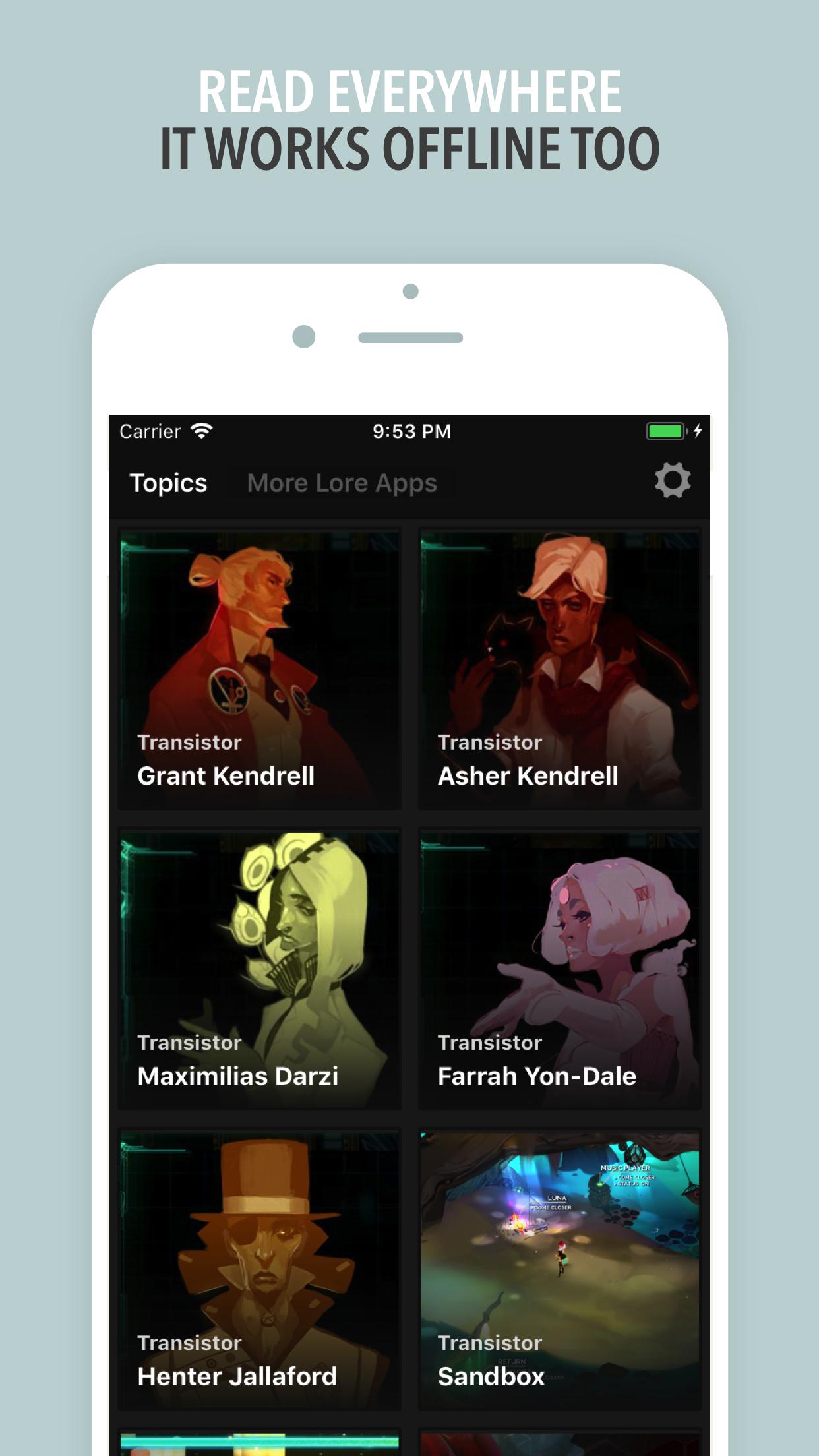 该应用程序包括故事,角色信息琐事,游戏玩法以及许多其他内容,例如晶体管游戏的照片和壁纸。