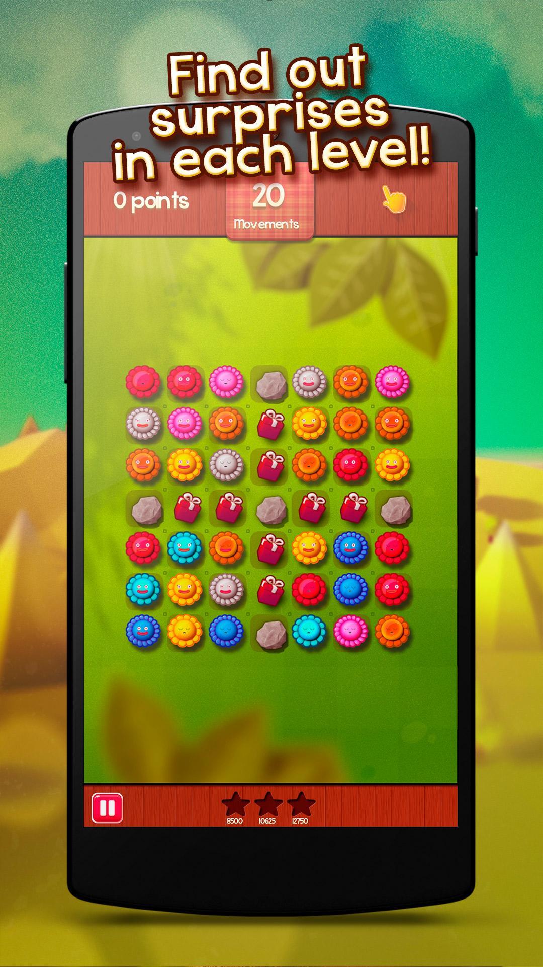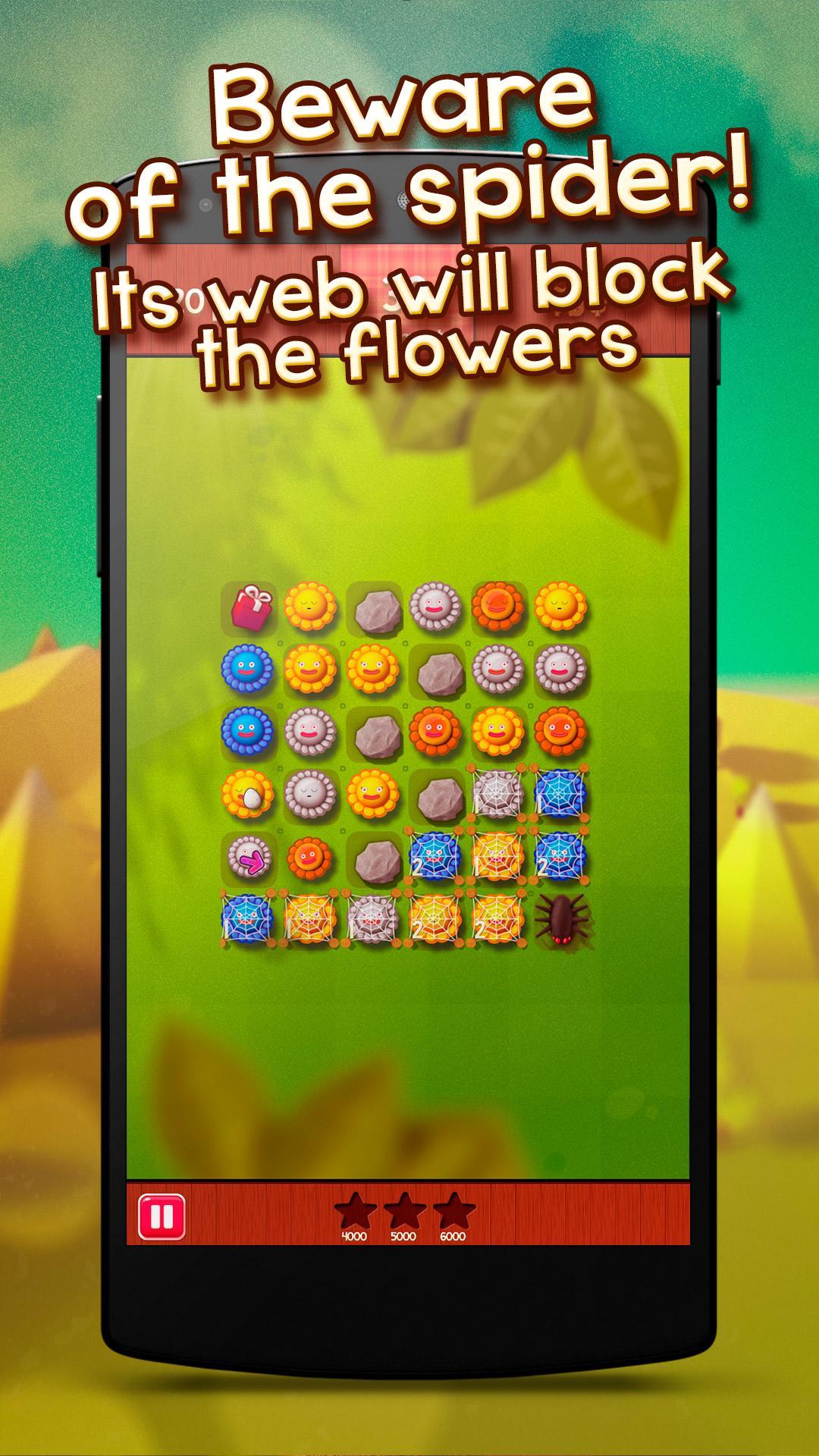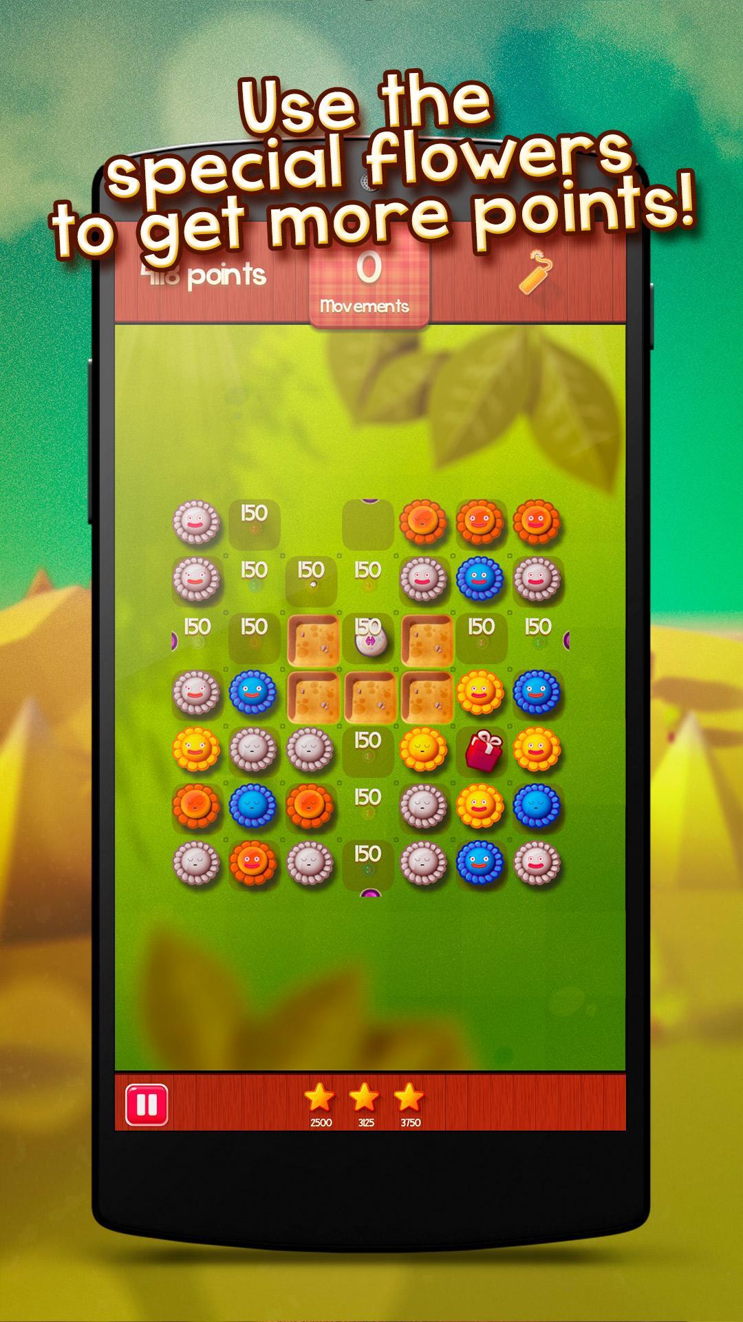 您的目標是將相同的花朵排成一層以製成組合。明智地計劃您的舉動,以無需時間限制即可得分最多!