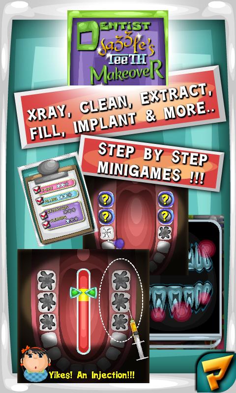 •一步一步的牙科程序,例如X射線,清潔,提取,填充物,植入迷你游戲設置!