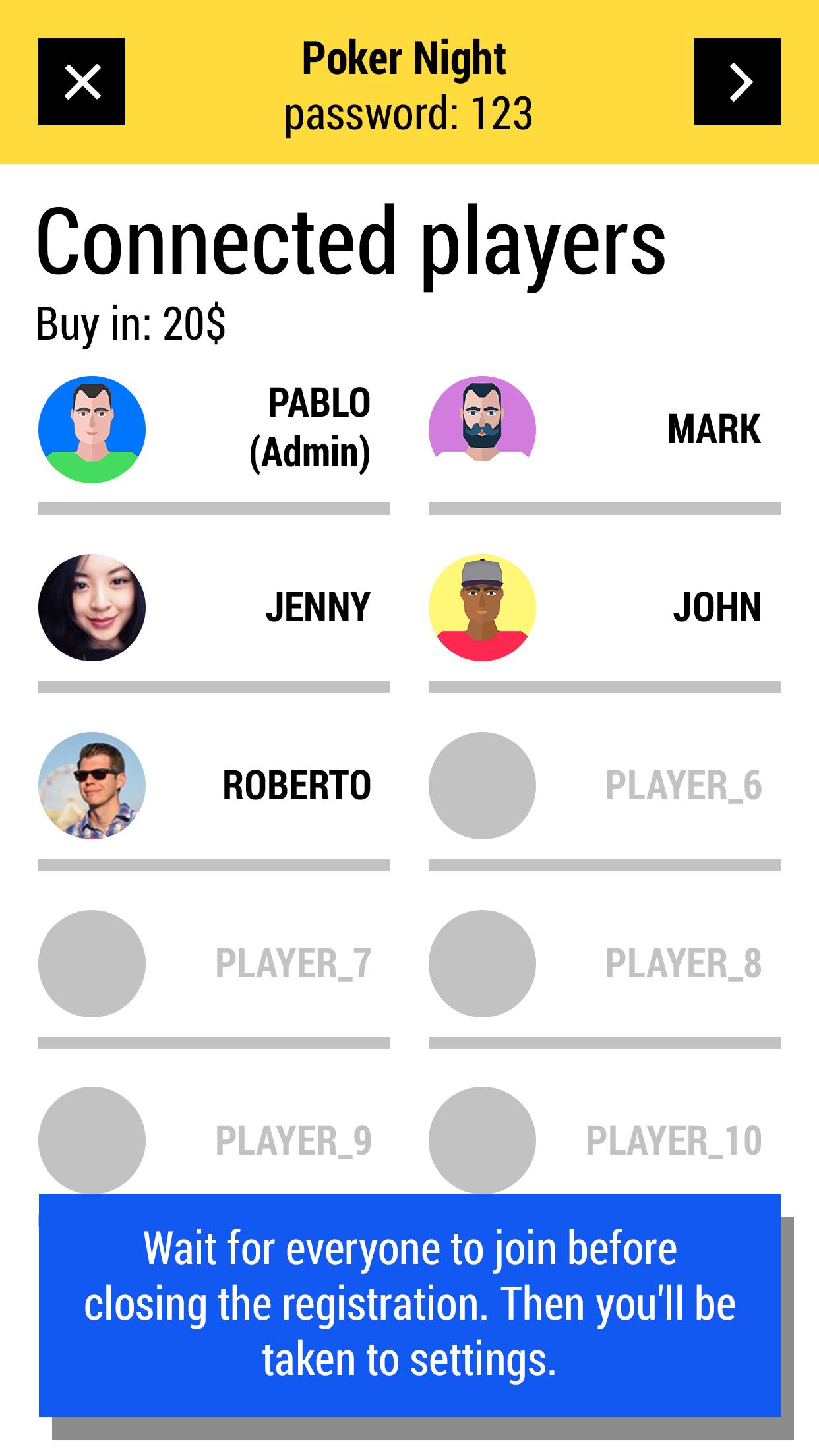 您是否想過要和您的朋友一起參加現場撲克比賽,但沒有撲克籌碼可以玩?現在,您可以下載跨平台移動應用程序,並將其用作物理撲克芯片的替代品。除了為您提供撲克芯片外,該應用程序還將指導比賽並就規則提供建議。你們中的一個創建了一個私人比賽並設置規則(開始堆棧,級別,支出),其他人可以通過選擇合適的房間並輸入密碼來加入組。每個玩家都需要智能手機來播放(以後我們將允許幾個玩家使用同一設備)。