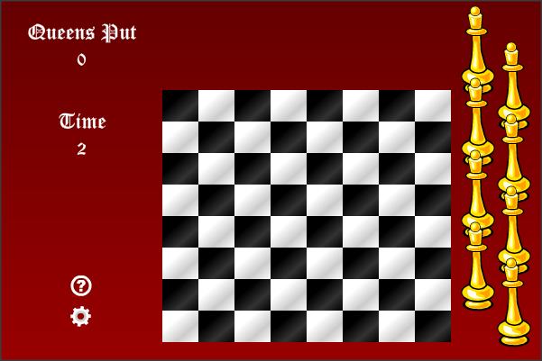 您可以通過將八個皇后放在董事會上,但阻止他們互相捕獲來為棋盤帶來和平嗎?在此遊戲中,您將獲得標準的棋盤,並將8個皇后放在板的右側。根據國際象棋的規則,女王可以沿垂直,水平或對角線方向捕獲同一條線上的另一片。您可以單擊並拖動碎片並將其放在木板上,但是請注意,沉降後不能將其刪除。如果女王在董事會上的另一個女王的捕獲線上,就無法放置。您放置的皇后人數和所花費的時間記錄在屏幕左側。當不再採取動作時,遊戲就結束了。征服皇后並贏得忠誠!
